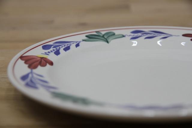 BOCH「Boerenbont」(製造年は1960年代から1980年代)シリーズのディナープレート。グリーン・ネイビー・バーガンディーの色で連なるようにボタニカルデザインがハンドペイントにて描かれている素敵な一点。とても状態が良いヴィンテージ品です。