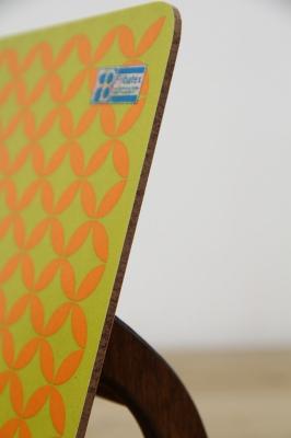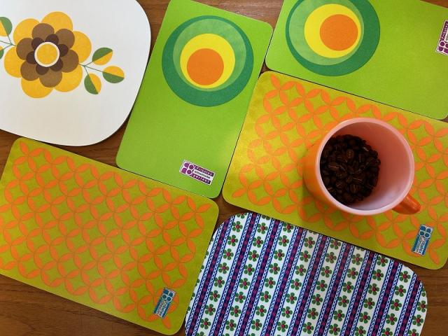 1970年代製の朝食用ボードです。メラミンラミネートされているドイツ製アイテム。パンなどの食品を置いたりコースターとして使ったりと、レトロな彩りを食卓で楽しんでくださいね。