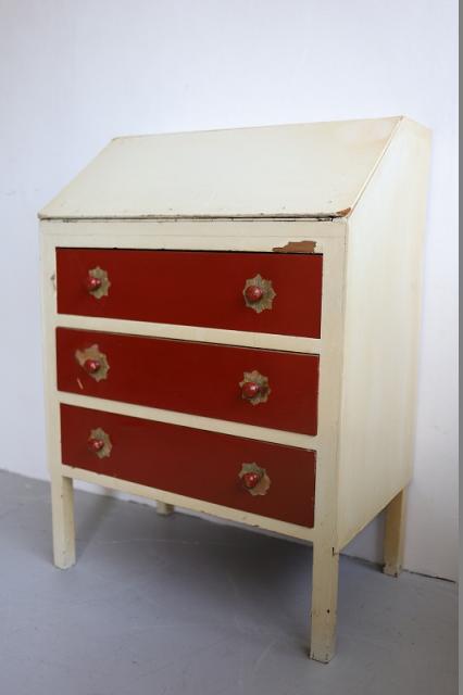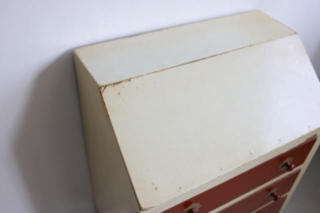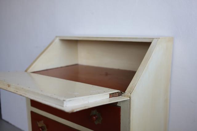 デンマークで見つけたチェスト。上段の扉を手前に引っ張ると大きな収納スペース、そして引き出し収納が3段というデザイン。赤と白のカラーペイントがどこか懐かしいようなレトロ感ある仕上げの可愛い家具です。