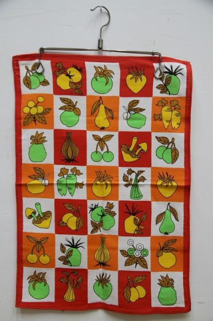 1970年代製のレトロなキッチンタオルです。キッチンを賑やかにしてくれるレトロプリントがとっても華やか。デットストック品です。
