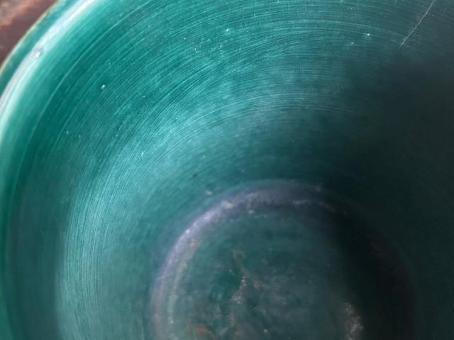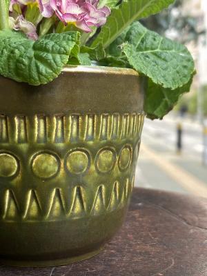 ドイツJasba製の陶器製フラワーポットです。オリーブの色は落ち着いた雰囲気で植物との相性も良く、内側のブルーグリーンのような色とのコントラストも美しいです。