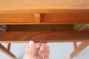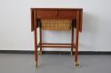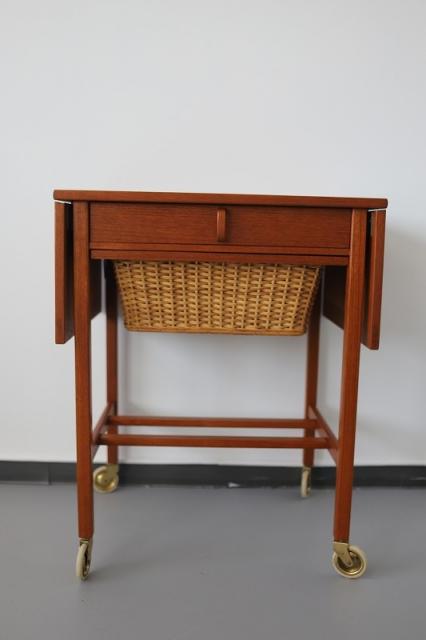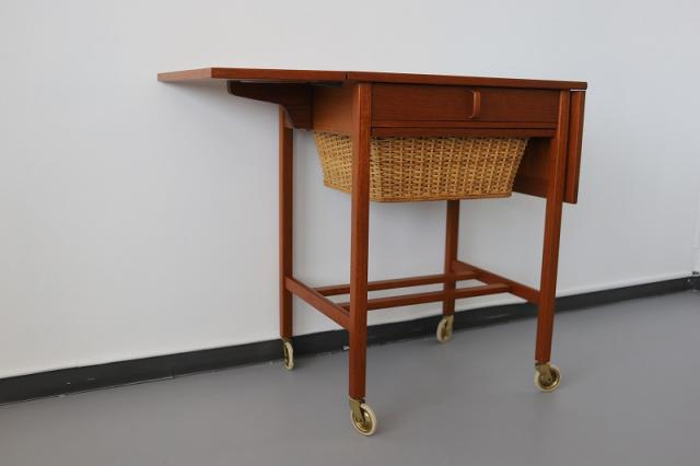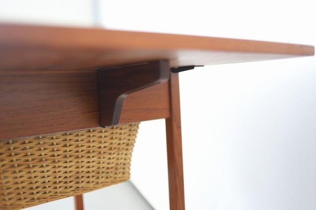 北欧で手芸用の収納とテーブルとして作られたソーイングテーブルと呼ばれる家具です。仕切りのある引き出しと可愛いカゴ収納で整理整頓がしやすく、エクステンション付きの天板はシチュエーションに合わせて広げて使うことができ、機能性の高さも魅力なデザインです。ソファーに座って使うサイズではなく、椅子に合わせて丁度いい高さ73cmというサイズはとっても珍しいと思います。