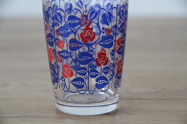 オランダから届いたジュースグラスです。薔薇の花をモチーフにしたレトロなプリントデザインがとっても美しく、スラっと伸びたグラスのフォルムも際立ちます。