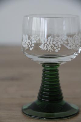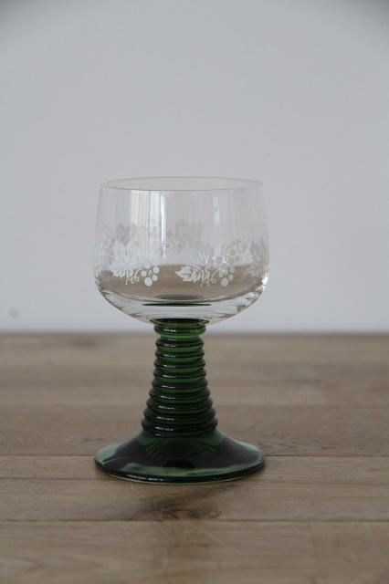 ドイツの伝統的なワイングラス「Romer Glass」レーマーグラスです。葡萄の絵柄や段々が付いたグラスの脚部分がデザインの特徴です。