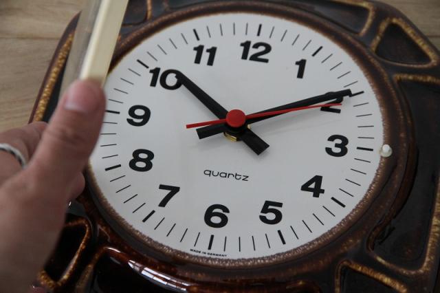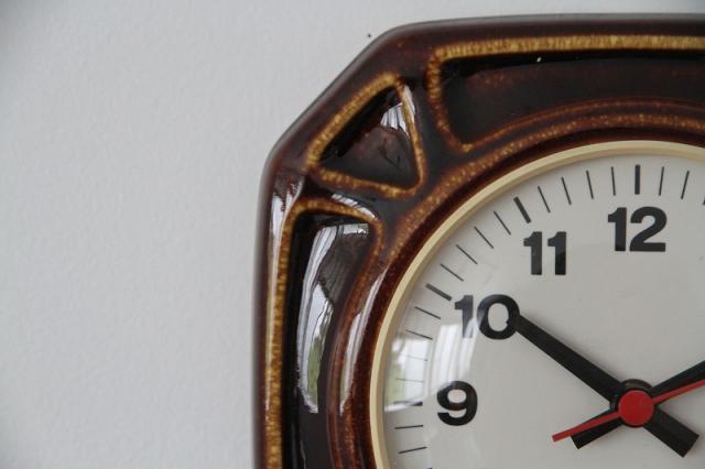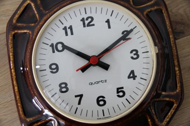 ドイツ製の陶器製掛時計。つややかな釉薬が目を惹きます。ブラウンを貴重としたデザインなのでお部屋に馴染みやすいです。