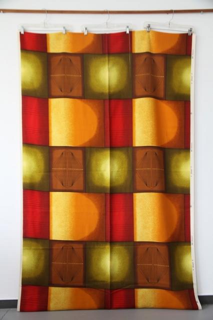 レトロな配色が素敵なカーテンファブリックです。素材は100%ポリノジック(生地のミミにプリントされています)。レーヨンを改良して作られた繊維で美しい光沢感とドレープ感があるのが特徴です。繊維から1990年代くらいのものかと思われます。