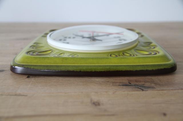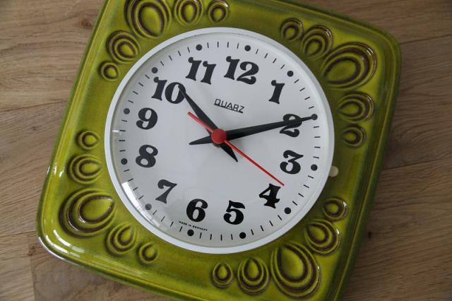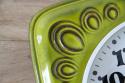 ドイツ製ヴィンテージの陶器製掛時計です。鮮やかなライムグリーンの色が目を惹きます。ぽってりとしたフォントとプラスチック製の針がレトロさを増してくれています。