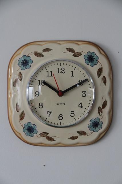 ドイツ製ヴィンテージの陶器製掛時計。ハンドペイントのフラワーモチーフの色使いがとっても素敵な一点。お部屋に優しい印象を与えてくれます♪