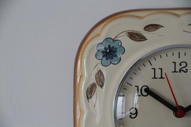 ドイツ製ヴィンテージの陶器製掛時計。ハンドペイントのフラワーモチーフの色使いがとっても素敵な一点。お部屋に優しい印象を与えてくれます♪