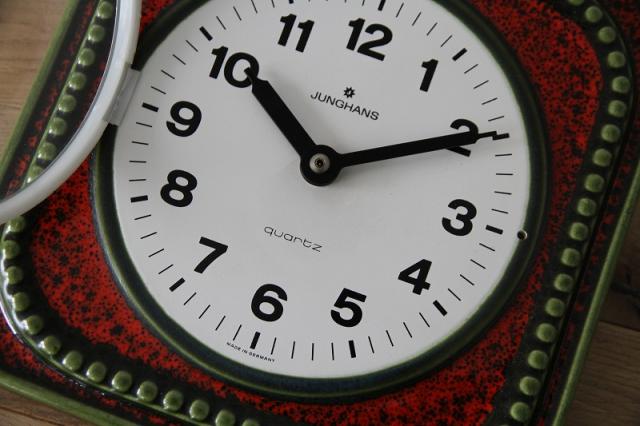 ドイツJUNGHASN社製の陶器製掛時計。レッド、グリーン、ブラックの色使いが渋くて惹かれる一点。グリーンピースのような飾りのデザインが可愛いですよ。
