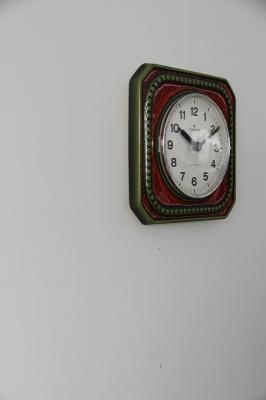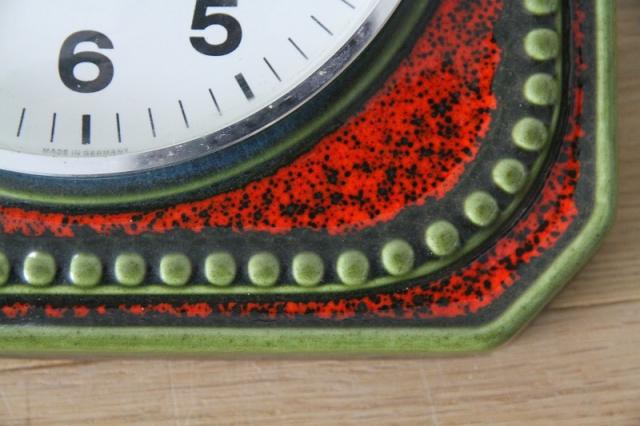 ドイツJUNGHASN社製の陶器製掛時計。レッド、グリーン、ブラックの色使いが渋くて惹かれる一点。グリーンピースのような飾りのデザインが可愛いですよ。