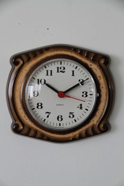ドイツヴィンテージの陶器製掛時計。ブラウンとベージュを基調としたシンプルな色使いです。(個人的にはなんだかネコバスみたいだ・・・と思いました♪)文字盤にWESTERN GERMANYの刻印あり、です。