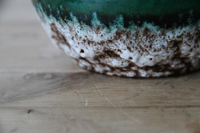 西ドイツにて製造されていた'Fat Lava'と呼ばれる陶磁器で、1848年創業と言われているJopeko社製のフラワーベースです。軽石のように凹凸ある釉薬と艶感ある鮮やかな緑の色のバランスが素敵な一点です。
