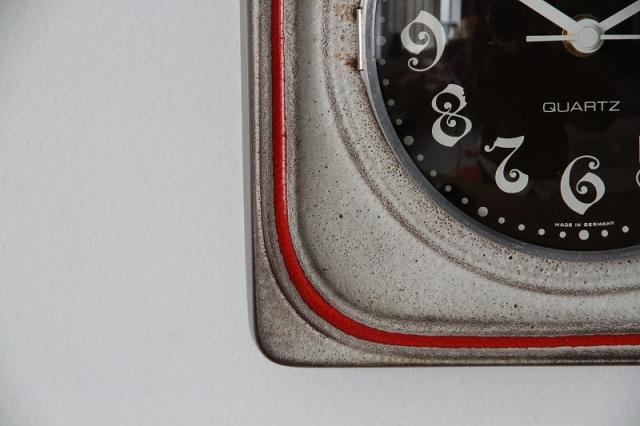 ドイツ製ヴィンテージの陶器掛時計。デザインはシンプルですが、重厚感ある質感とオレンジのラインが際立つデザインは、とても存在感あるインテリアになりそう。