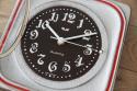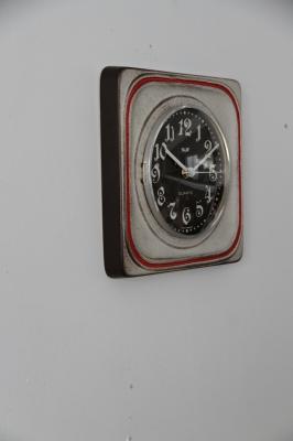 ドイツ製ヴィンテージの陶器掛時計。デザインはシンプルですが、重厚感ある質感とオレンジのラインが際立つデザインは、とても存在感あるインテリアになりそう。