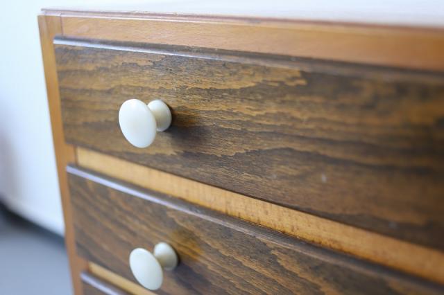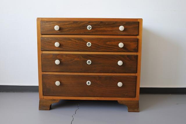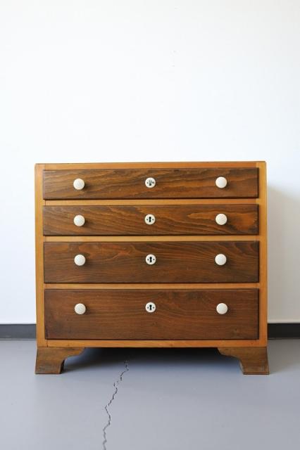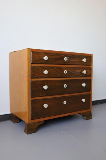 北欧デンマーク買付便の4段チェストです。ツートンの木目と引き出しの取手などの白のパーツの組み合わせがとってもレトロ。どっしりとしたつくりで安定感があります。