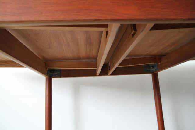 北欧デンマーク買付のエクステンション付きダイニングテーブル。中央の天板下にエクステンションが内蔵されているような構造で、下から引き出すことで広く使うことができます。シチュエーションに合わせてスペースをうまく活用できる便利なテーブルです。