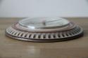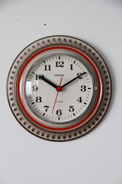 ドイツEUROPA社製ヴィンテージの陶器製掛時計。ライトグレーの陶板にダークなオレンジのラインが印象的なデザインです。
