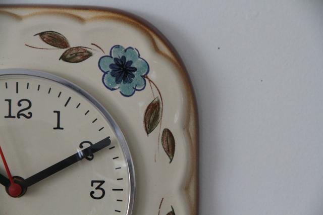 ドイツ製ヴィンテージの陶器製掛時計。ハンドペイントのフラワーモチーフの色使いがとっても素敵な一点。お部屋に優しい印象を与えてくれます♪