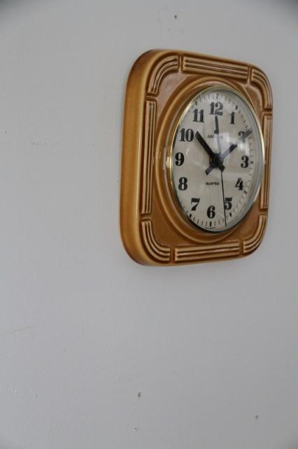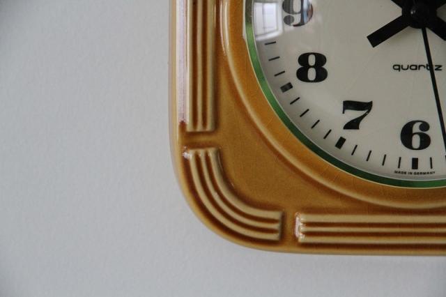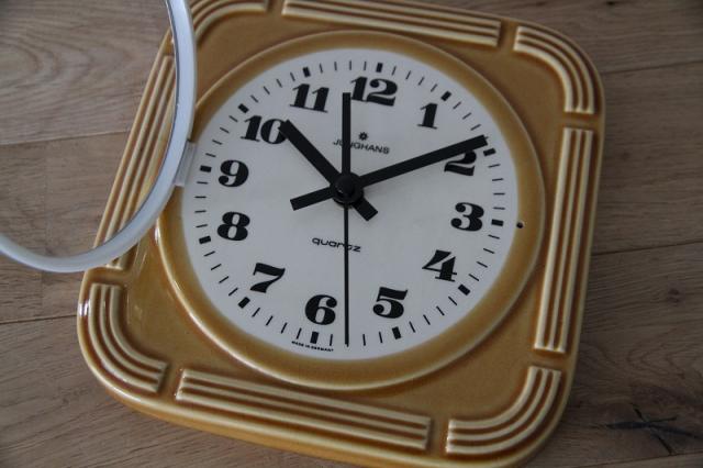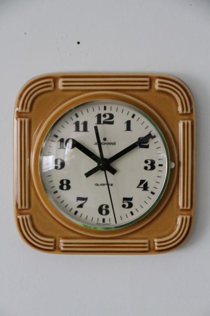 ドイツJUNGHANS社製の陶器製掛時計。カラメルのような甘い、可愛い色合いのデザインです。ご結婚のお祝いや新築祝いなど、ギフトにもオススメです。※3箇所、割と目立つヒビ割れ箇所あります※