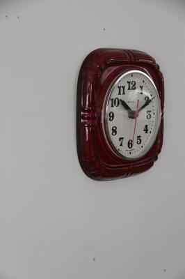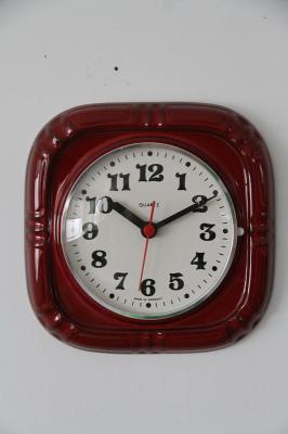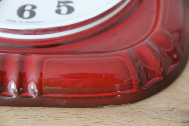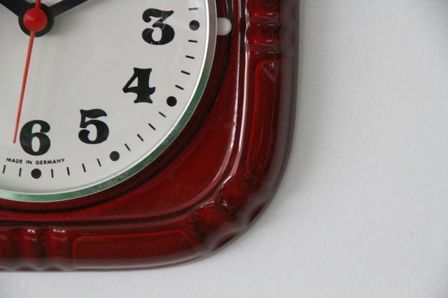ドイツ製ヴィンテージの陶器製掛時計です。吸い込まれるかのような美しい赤の色がとても印象的な一点です。