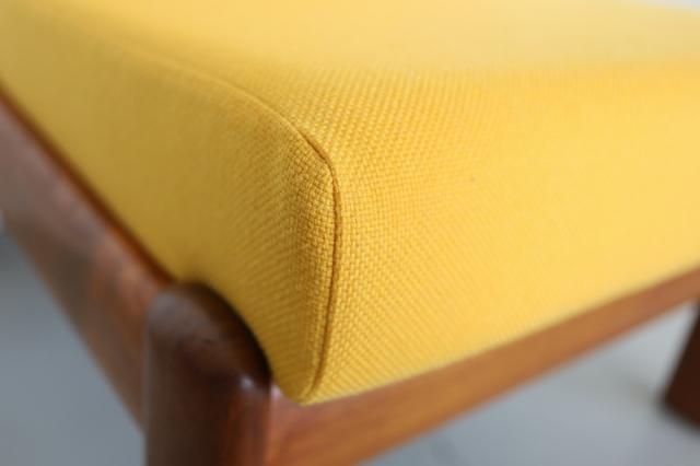 ドイツ買付便の一人掛けソファ。ソリッドチークのフレームから溢れる重厚感、そして丸みをつけた丁寧なつくりは見事です。生地の張替えとウレタン交換済、スプリング部分を保護するための生地も張替えています。