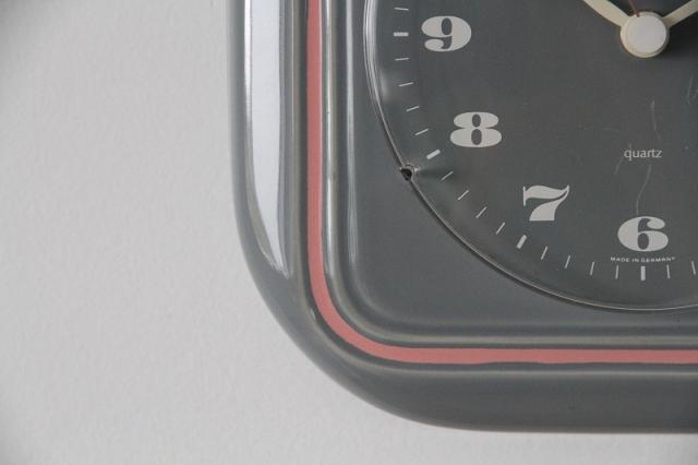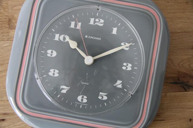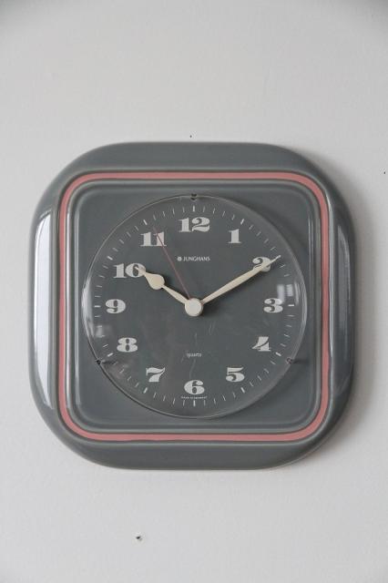 ドイツJUNGHASN社製の陶器製掛時計。ライトグレーにピンクのライン、とても珍しい色合いの一点だと思います。※プラスチック製の蓋にはキズがあります※