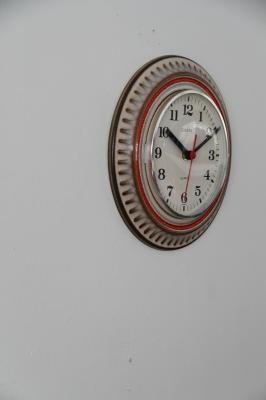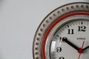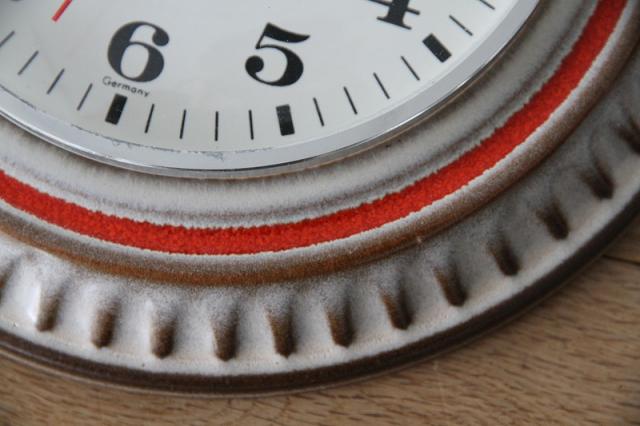ドイツEUROPA社製ヴィンテージの陶器製掛時計。ライトグレーの陶板にダークなオレンジのラインが印象的なデザインです。