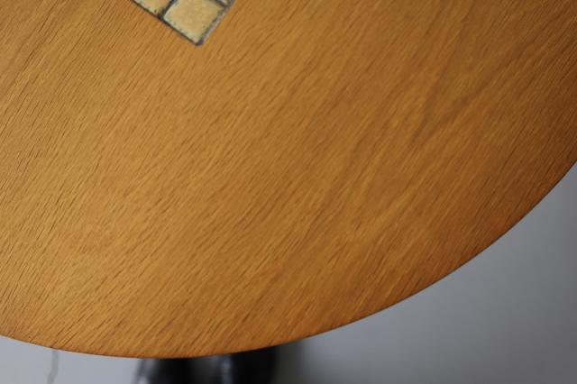 デザインのアクセントとしてテーブル天板にはタイルが埋め込まれています。脚は金属製です。脚先のカバーは2ヶ所ついていません。(詳細写真でお確かめください。)